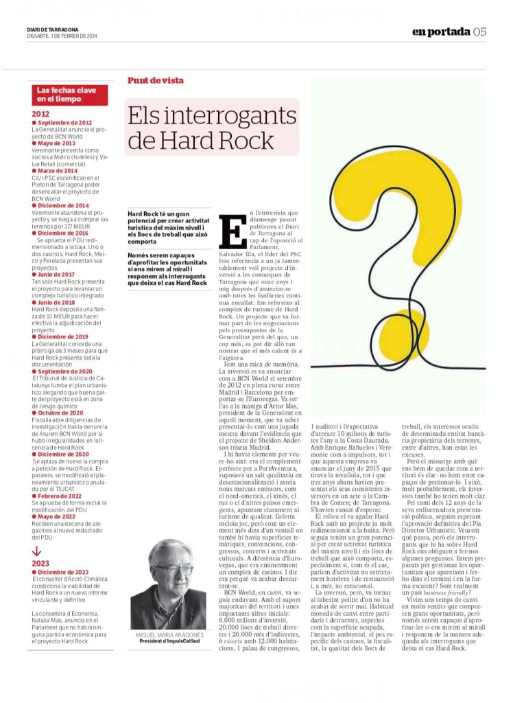 Els interrogants del Hard Rock (Miquel Maria Aragonès – President d’ImpulsCatSud) En l’entrevista que diumenge passat publicava el Diari de Tarragona al cap de l’oposició, Salvador Illa, el líder del PSC feia referència a un ja lamentablement vell projecte d’inversió a les comarques de Tarragona que onze any i mig després d’anunciar-se continua encallat. Em […]